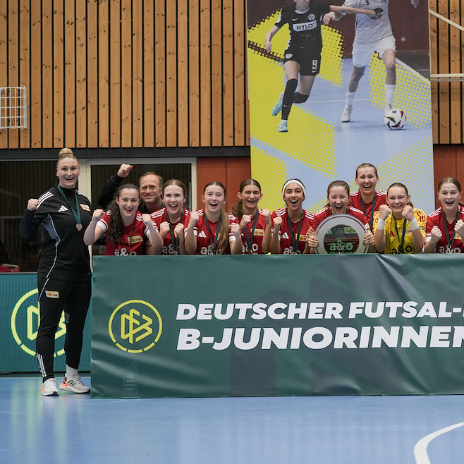 | | | | U23 erreicht Platz 3: U17-Juniorinnen verteidigen Deutsche Futsalmeisterschaft Bei der diesjährigen Deutschen Futsalmeisterschaft in Duisburg-Wedau präsentierten sich unsere U17-Juniorinnen und U23-Frauen in bester Verfassung. Während die U23 auf Rang 3 landete, gelang den U17-Juniorinnen die Titelverteidigung. | | | | | | |